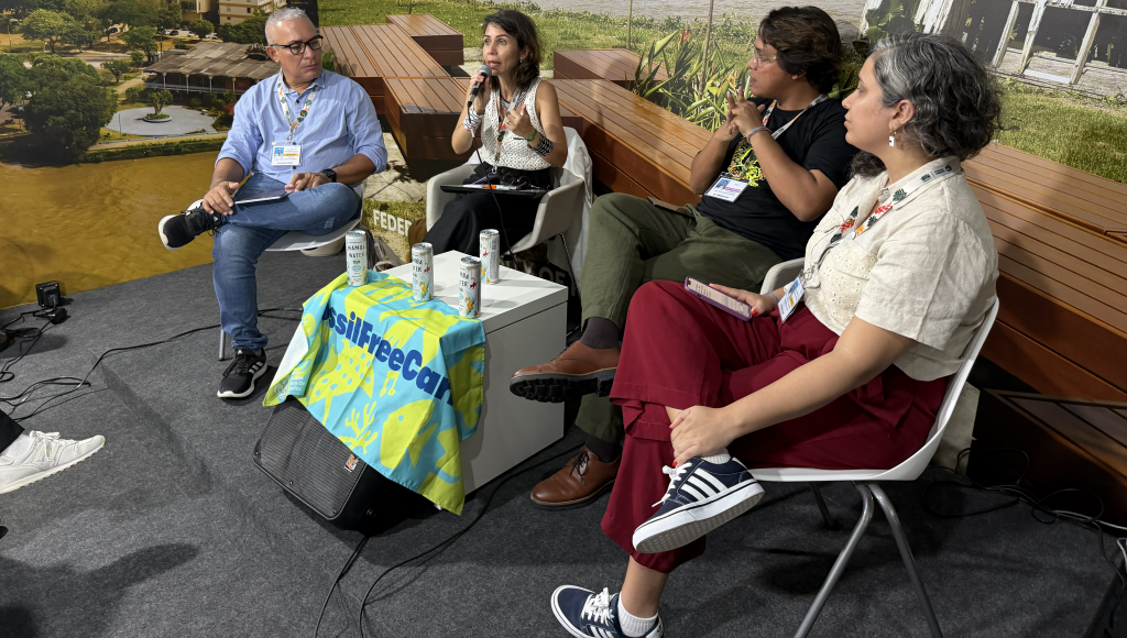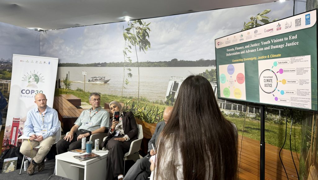 A programação começou às 9h, com o Painel “Forests, Finance, and Justice: Youth Visions to End Deforestation and Advance Loss and Damage Justice” ou “Florestas, finanças e justiça: visões da juventude para acabar com o desmatamento e promover a justiça por perdas e danos”. A sessão reuniu perspectivas de jovens sobre caminhos para acabar com o desmatamento e avançar na justiça climática.